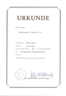 Der Anglerverein beschloss eine eigene Satzung und wird seit dem 23. März 1992 unter der laufenden Nummer 237 des